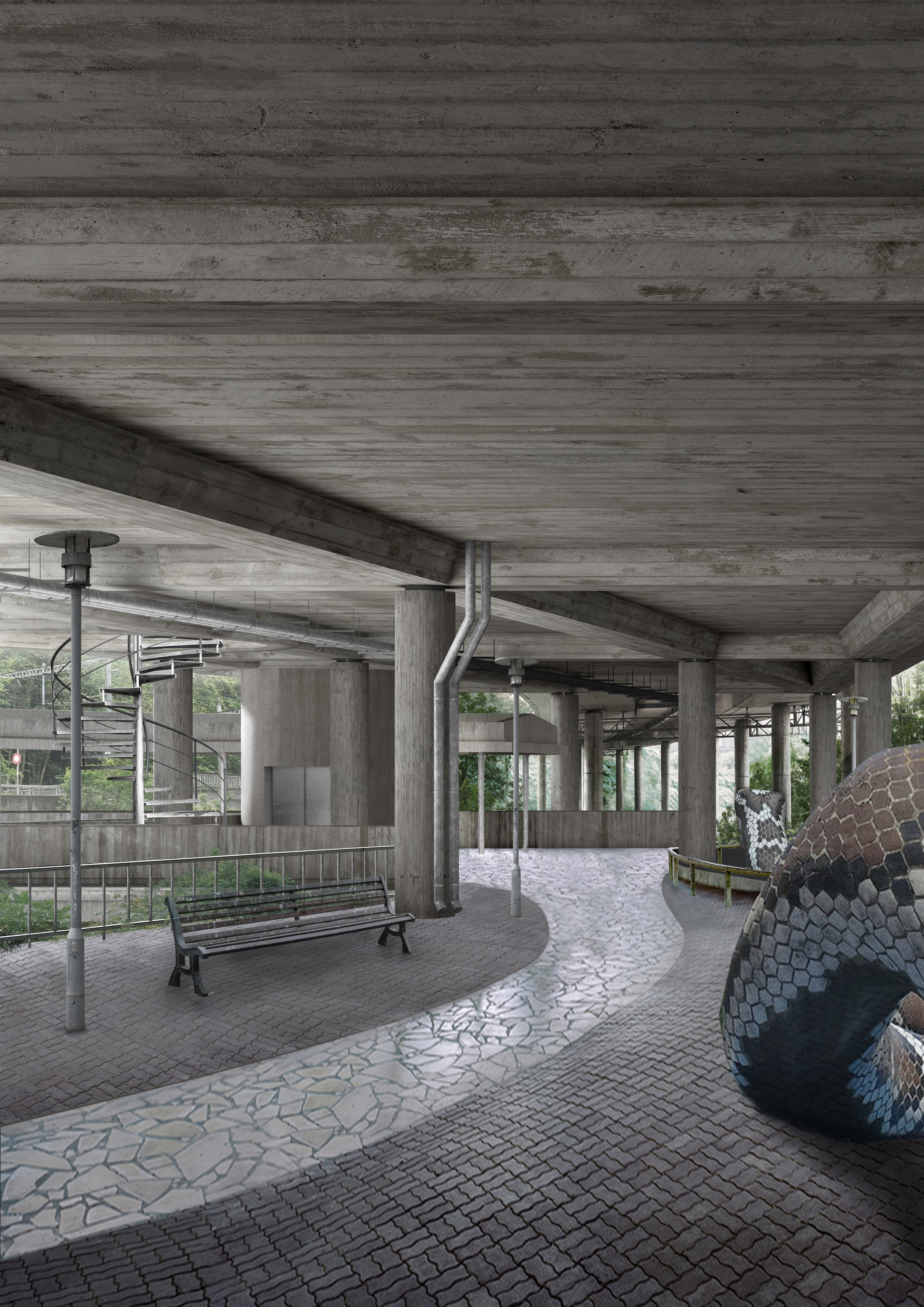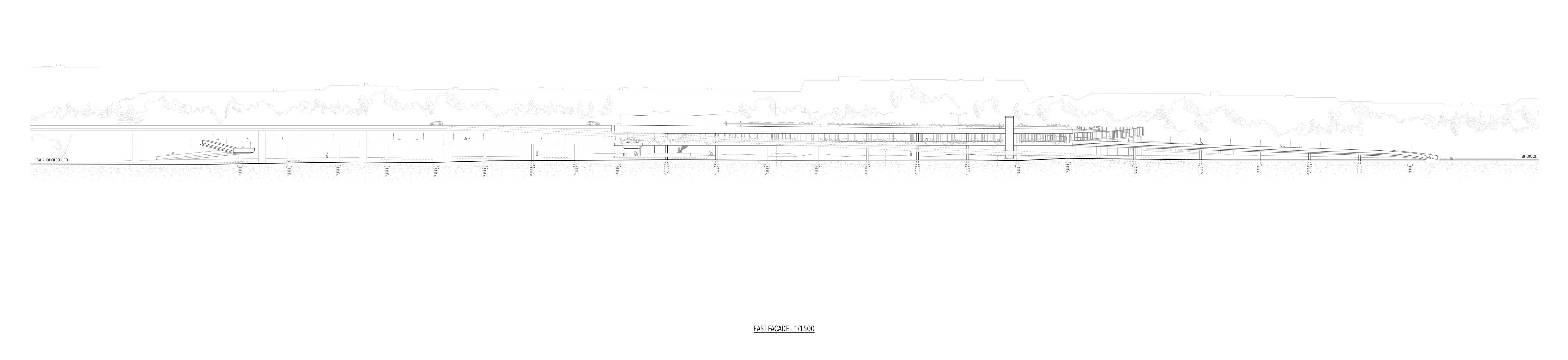 Es strebt deswegen weniger die Form eines Objekts oder Gebäudes an, sondern mehr ein verbundenes und heterogenes System, das die gegensätzlichen Räume miteinander verschmelzen lässt. Es soll nicht weiter ein abgekapselter Durchgangsort bleiben, sondern eine Verbindung vom Banhof Giesshübel, dem Google Areal und dem Quartier Wiedikon werden.
