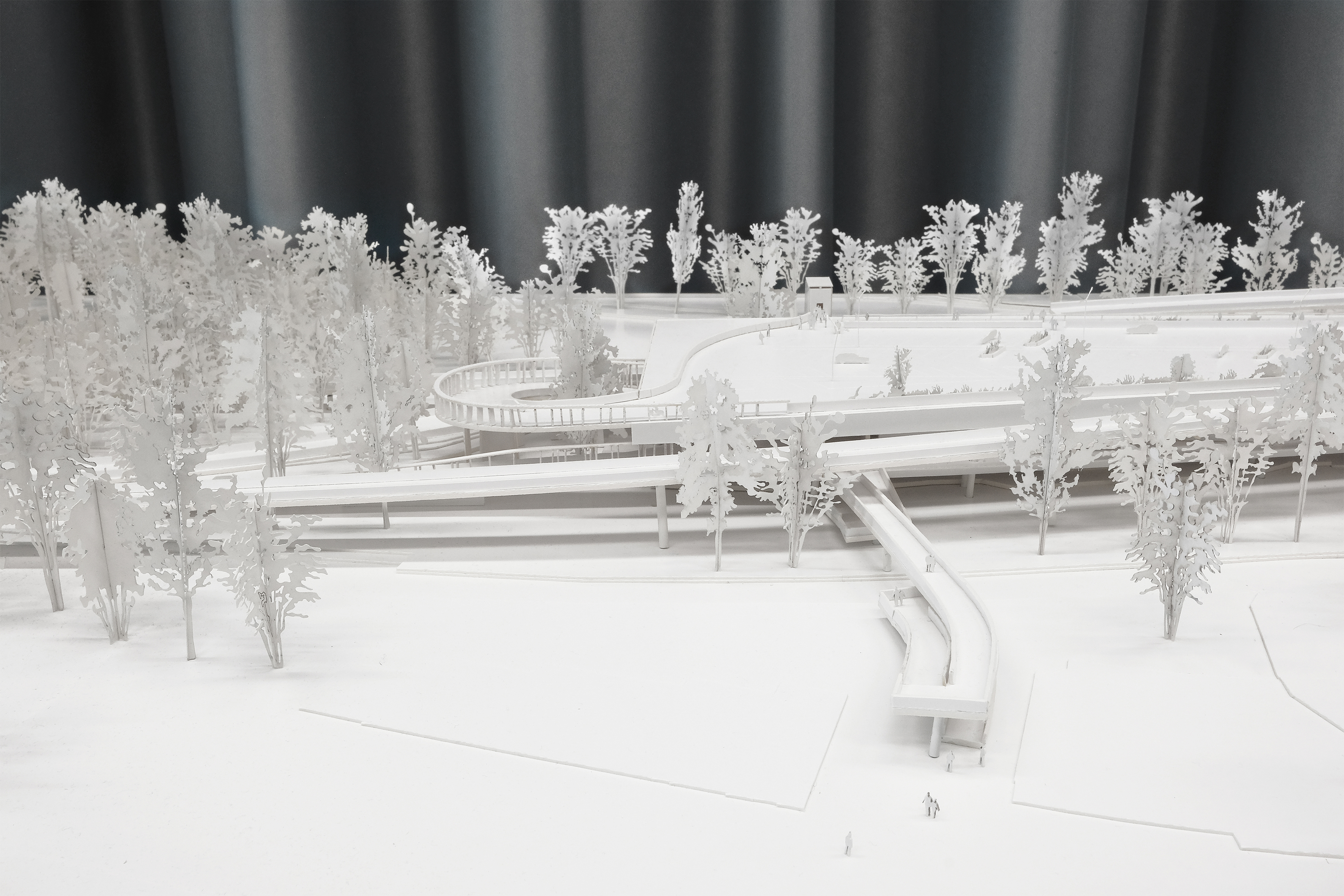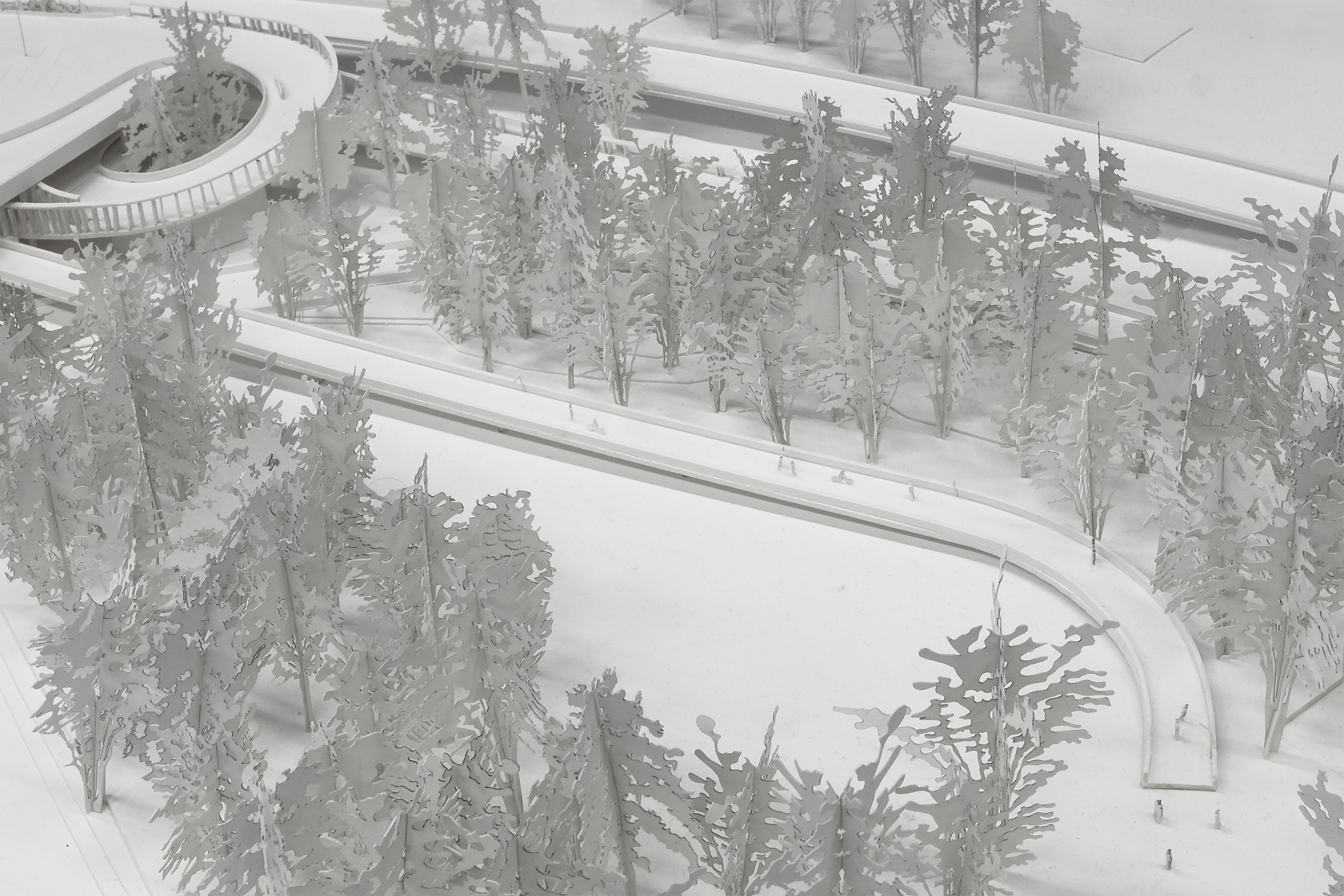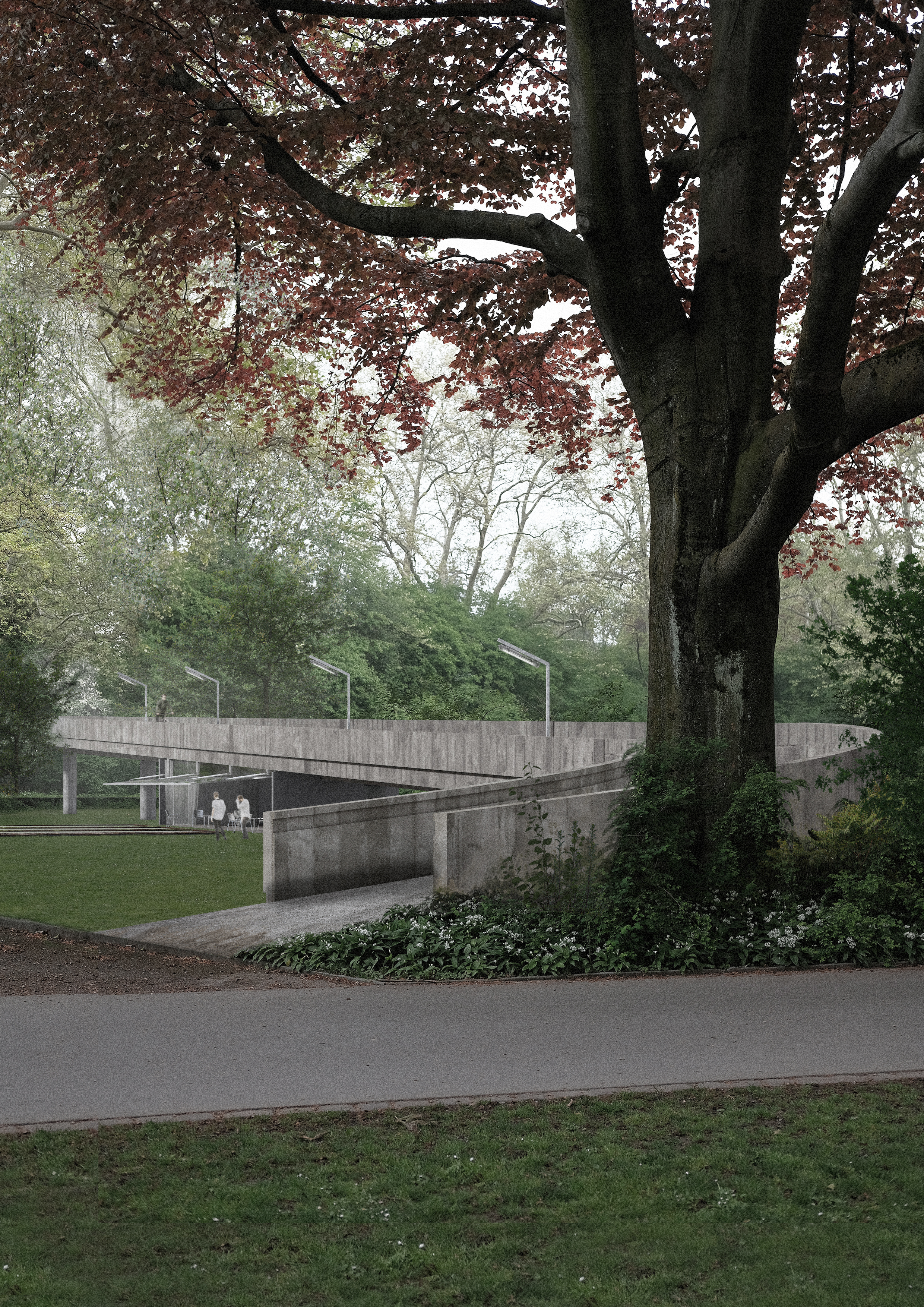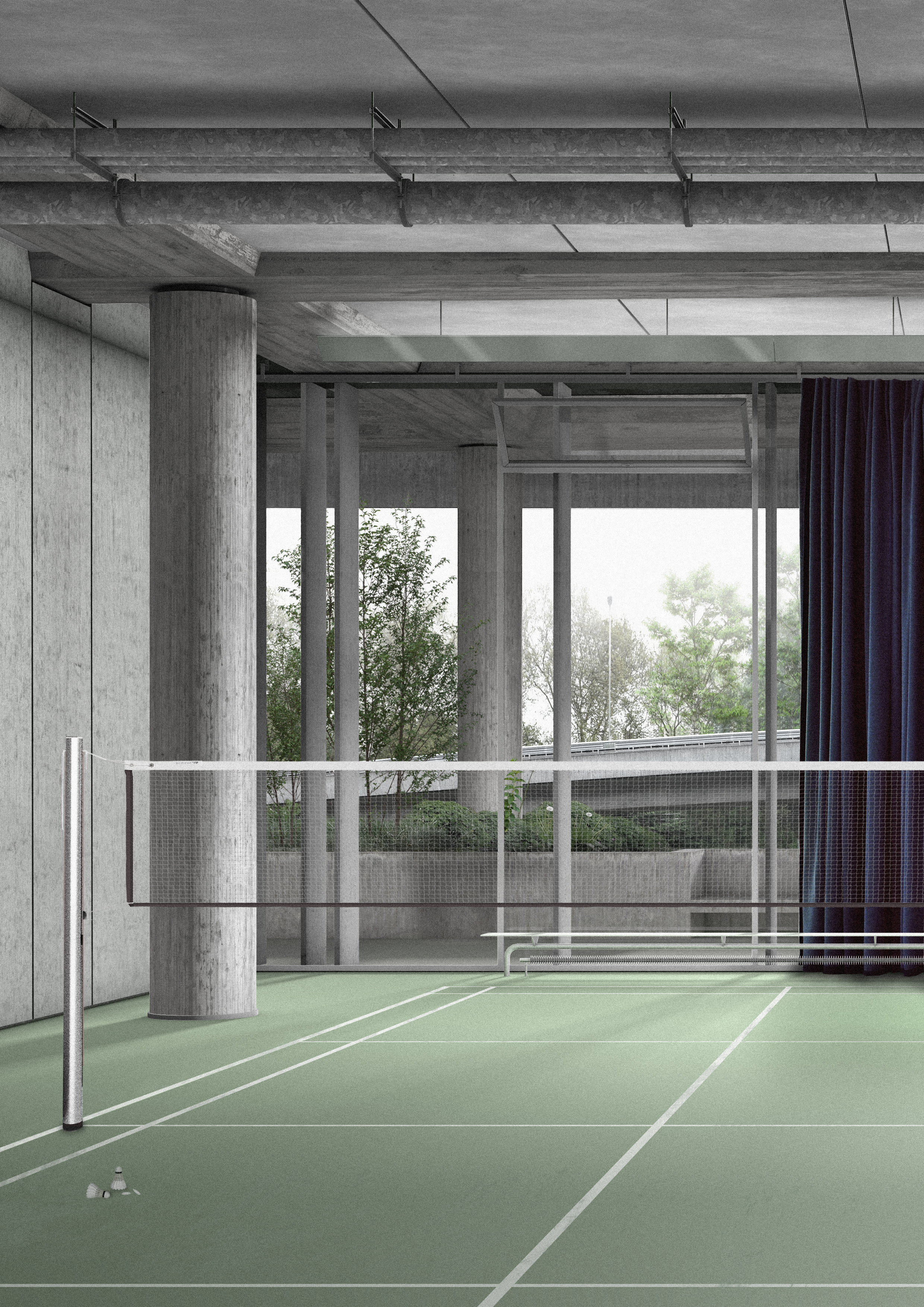 Parkfelder auf der obersten Ebene sind von der Sihlhochstrasse aus direkt erschlossen und dienen den darunter liegenden Ebenen. Grosszügige Grünfelder machen den Ort aber auch für Fussgänger zu einem angenehmen Aufenthaltsort mit einer tollen Sicht auf die Stadt. Die anderen Ebenen hingegen sind eine Erweiterung der Sportinfrastruktur. Ein neuer Steg vom Sihlhözli bis zum Bahnhof Giesshübel dehnt nicht nur die Sportanlage aus, sondern bildet eine neue Verbindung für Fahrräder und Fussgänger. Diese werden neu nur noch oberirdisch geführt, so dass ein visueller Bezug zwischen den verschiedenen Teilbereichen entsteht. Auf der Sihlebene findet man die Idee des Terrain Vague wieder, einer urbanen Fläche, welche sich die Bevölkerung aneignen kann. Eine Kletterwand und ein Spielplatz inizieren diese vorgesehene Entwicklung.