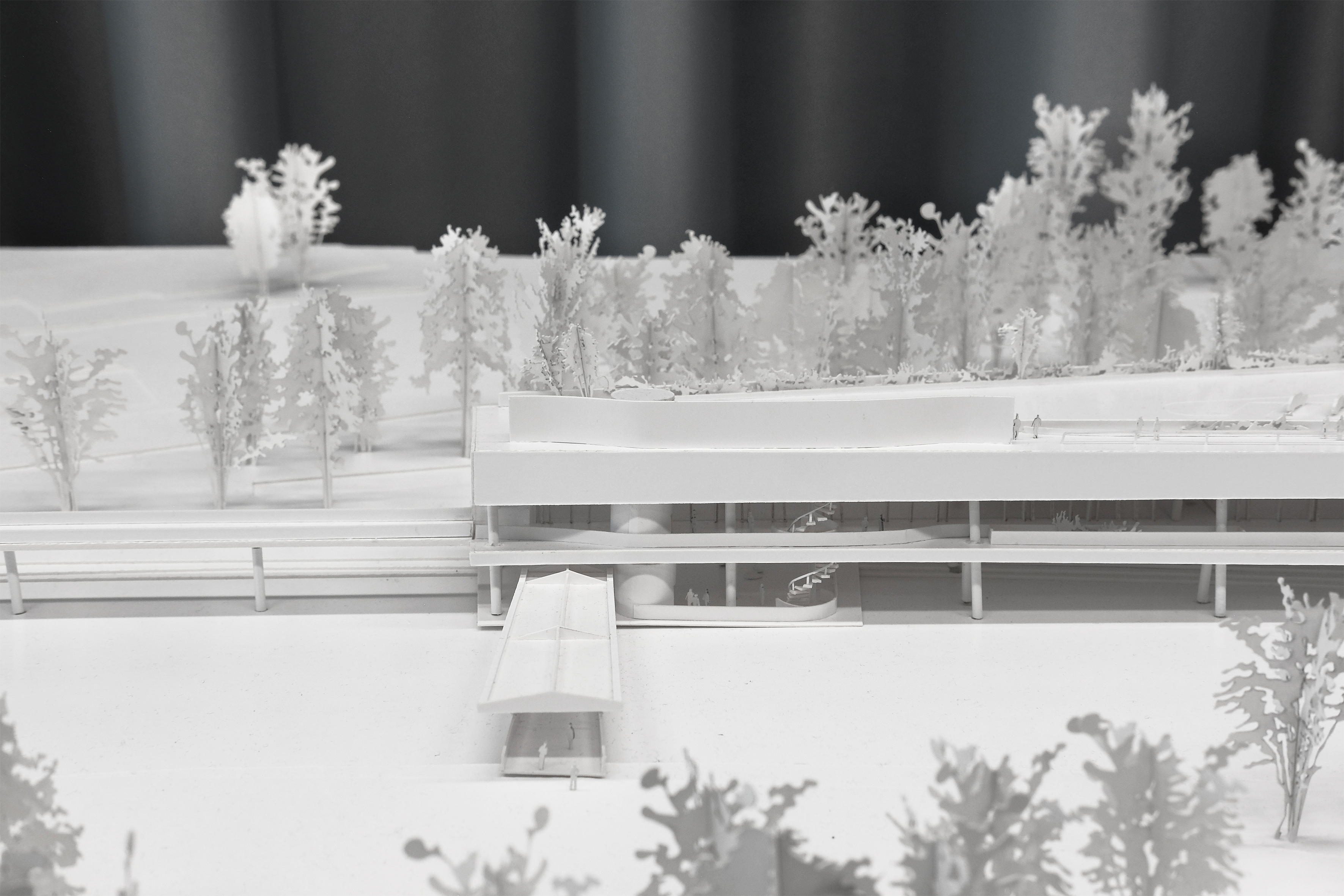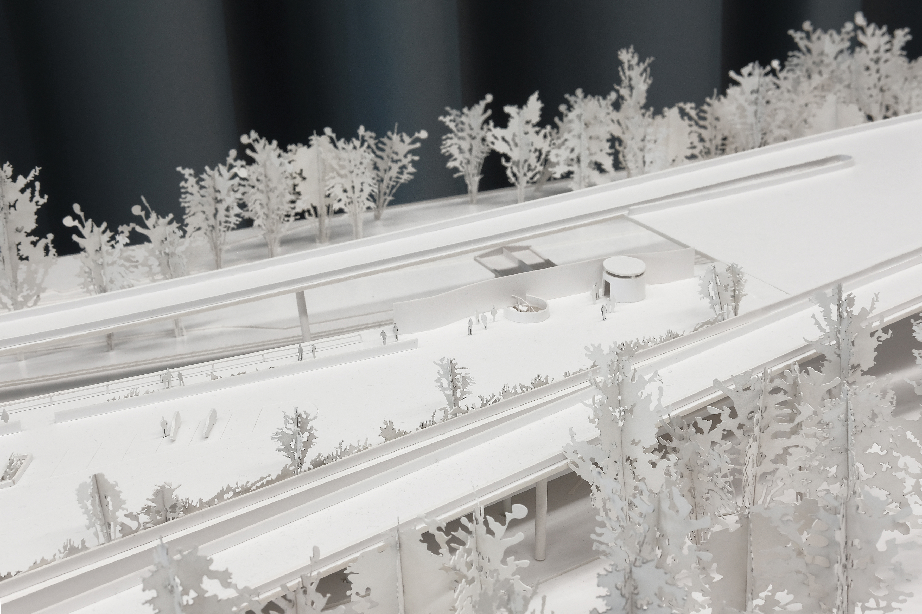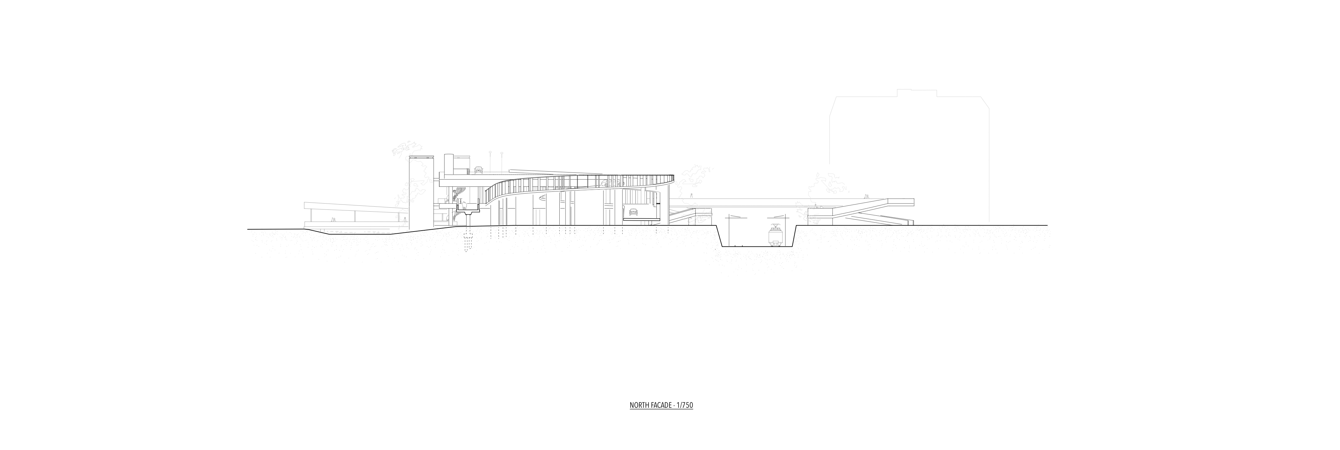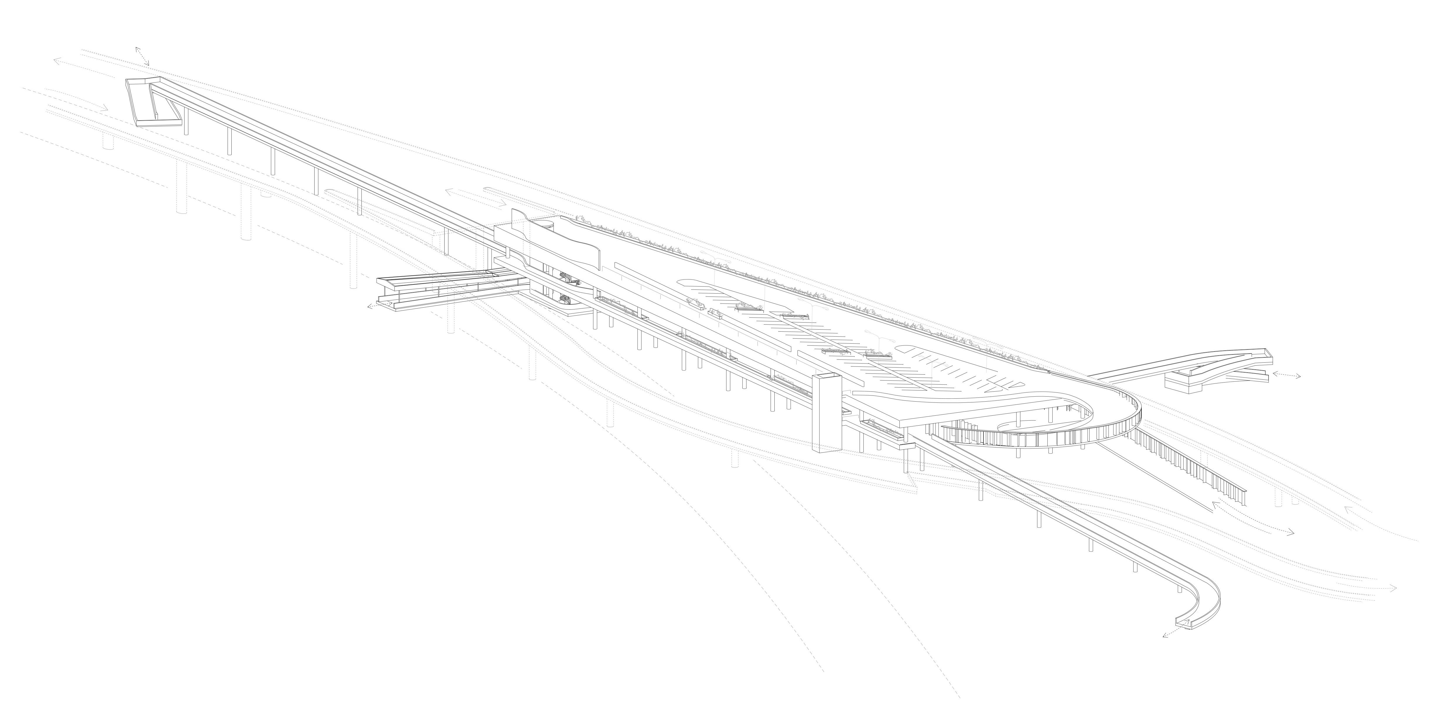 Der Entwurf möchte sich die Besonderheiten des Ortes zur Grundlage des Konzepts machen. Momentan steht die Grosszügikeit der Natur, also des Flusses und seiner Vegetation in hartem Kontrast zum Beton. Es wird versucht ein Projekt zu entwerfen, das nicht der Infrastruktur widerspricht, sondern im Gegenteil aus diesen spezifischen Konditionen entsteht. Um die Debatte abzuschliessen, aber auch um diesem unklaren Gelände einen Sinn zu geben, schlägt das Projekt eine Erweiterung der bestehenden Infrastruktur vor.