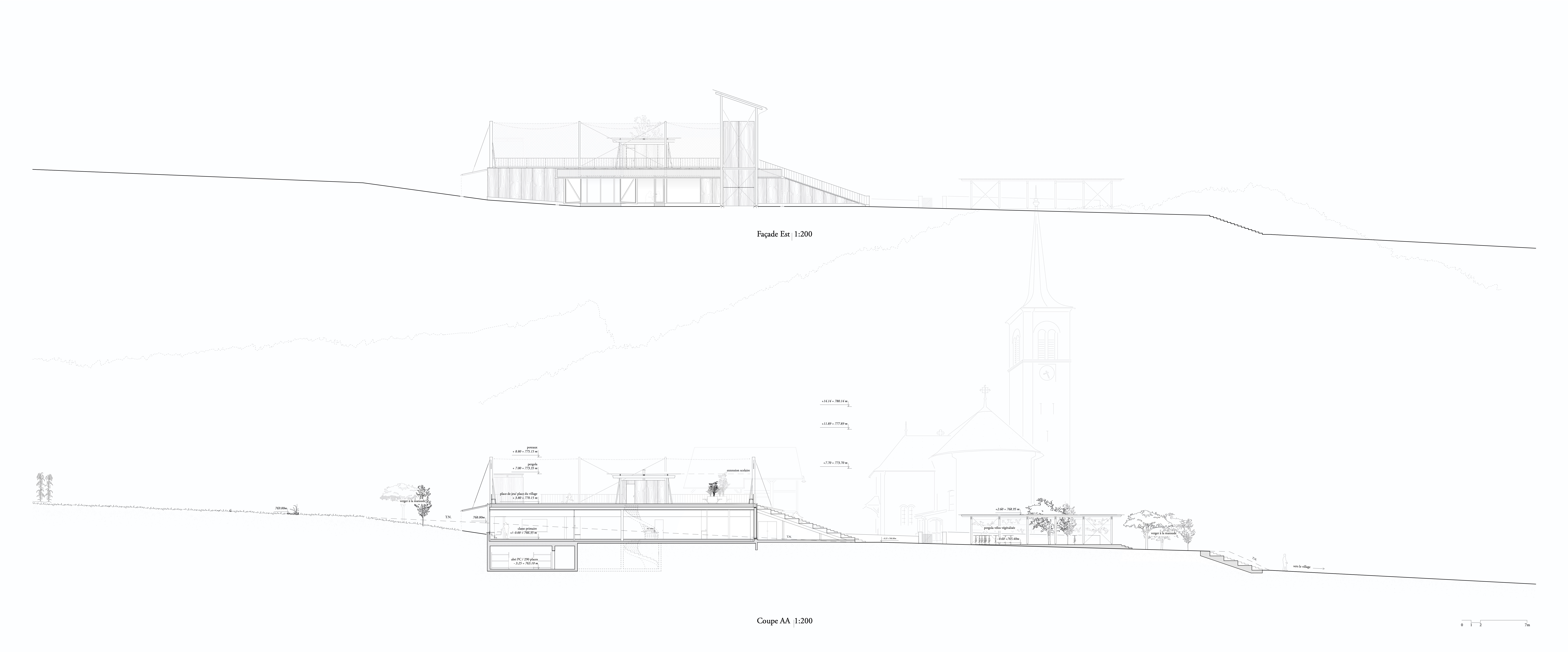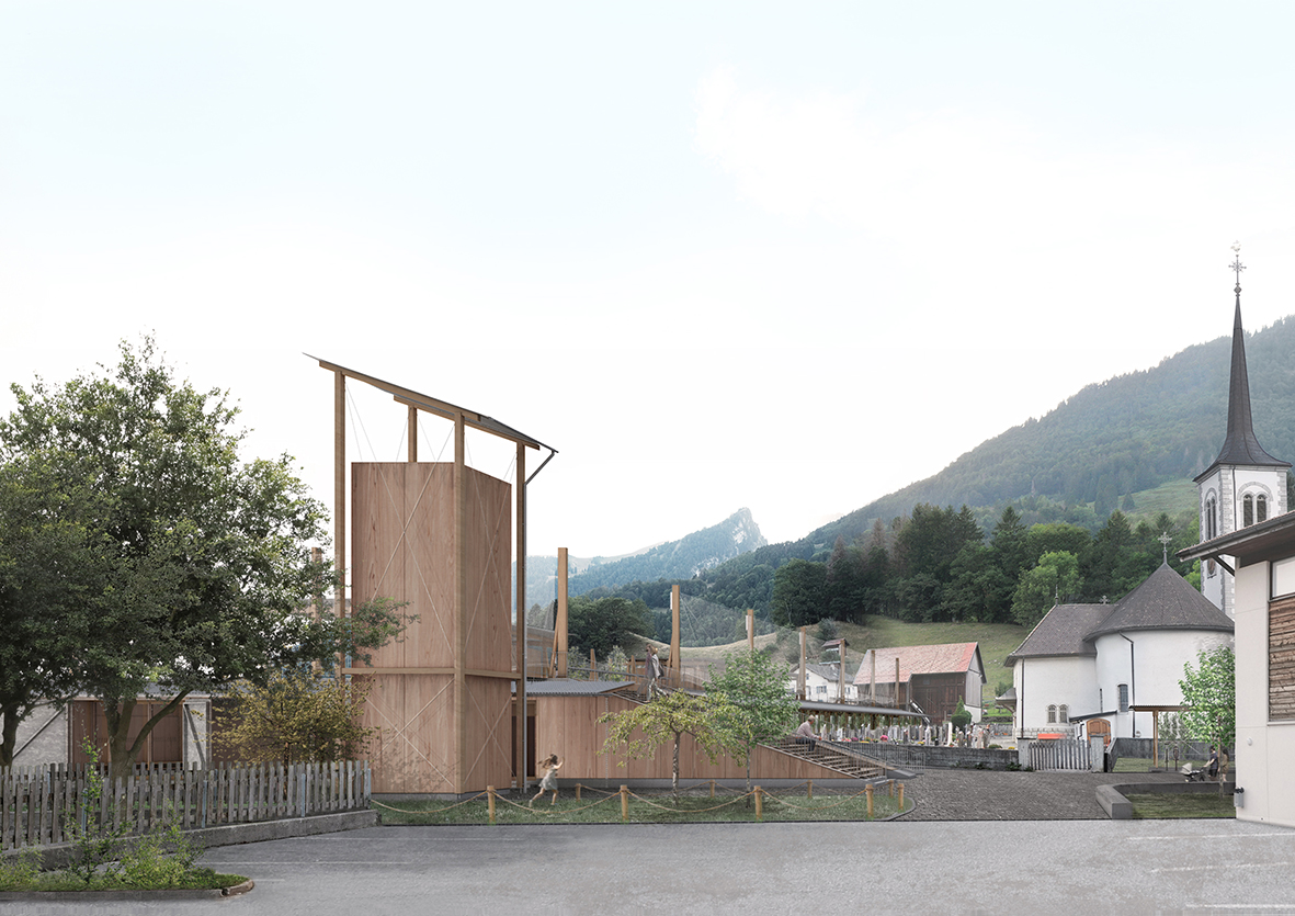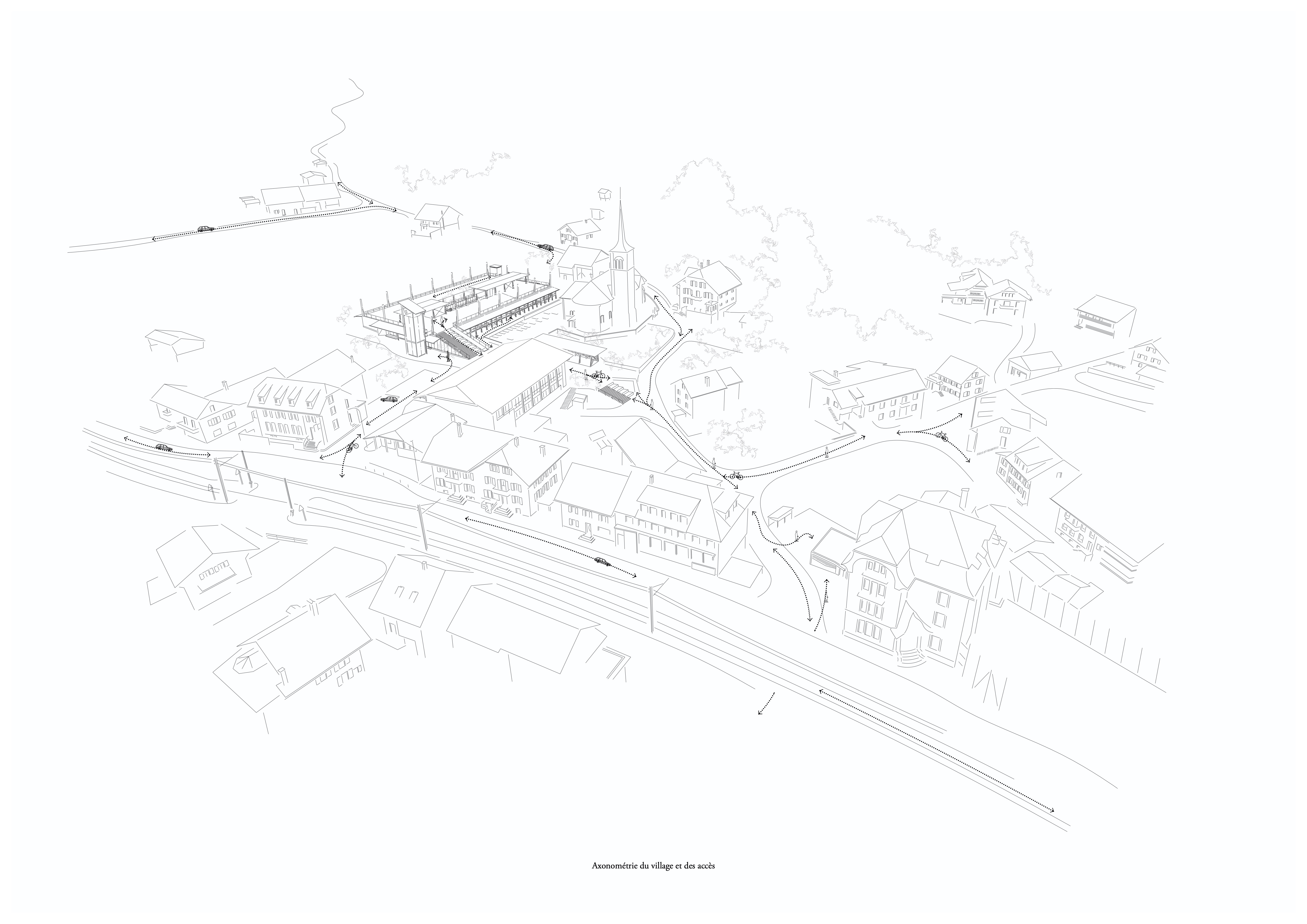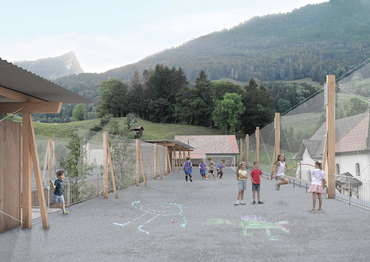 Le périmètre de concours pour l’école de Neirivue se trouve en limite du village. A cet endroit, la présence de l’église est l’élément marquant et agit comme élément distinctif pour tout le village. La salle de gymnastique et le restaurant du Lion d’Or complètent cet ensemble de bâtiments publics et constituent le décor idéal d’une vie publique villageoise active. Les vues privilégiées sur l’église imprègnent les lieux, mais c’est inévitablement les panoramas de tous côtés sur les montagnes et la verte Gruyère qui en font la principale richesse. Symboliquement la future école se doit de se servir de ces qualités contextuelles. Le parti a donc été pris de projeter toute l’école sur un seul étage, minimisant l’impact visuel du bâtiment vis-à-vis de son contexte. Plutôt que de boucher l’espace, le nouveau bâtiment propose d’en créer en offrant sa toiture en belvédère. Cette surface, identique à la parcelle sur laquelle s’inscrit le projet, joue le double rôle de cour d’école et de place de village et de se défaire de la relative exiguïté de la parcelle. Un nouvel accès depuis le village doit être crée, permettant à tous les types de mobilité de cheminer naturellement du passage sous-voie à la nouvelle place du village. Cette transition est amenée en douceur par un escalier « paysager » ainsi qu’une rampe adaptée aux mobilités douces. Cet escalier traverse un verger de maraude où des fruitiers en moyenne-tige animent le lieu au fil des saisons. Le parc à vélos et le soutènement de l’Eglise sont tout deux végétalisés par des plantes grimpantes persistantes participant à leur intégration visuelle à proximité du verger. Cet aménagement reprend l’ambiance villageoise traditionnelle, entre pavés de pierre et verger sur prairie fleurie. L’accès routier et les places de parc sont réalisés en enrobé perméable et disposés selon le programme à l’est et l’ouest de l’école. Le parking principal de l’école et la dépose bus scolaire est lui organisés autour d’un îlot central sur lequel se dresse un arbre majeur (Noyer). Cet arbre d’un côté et la tour de bois de l’autre marquent les entrées du bâtiments.