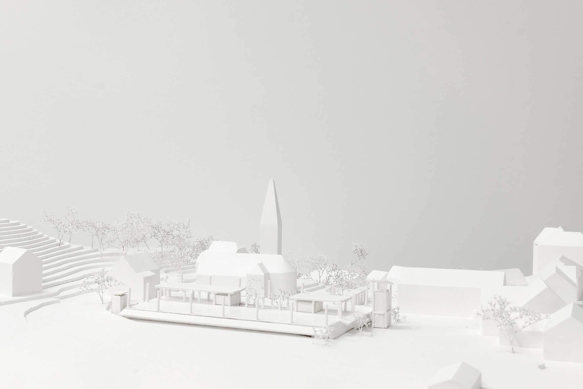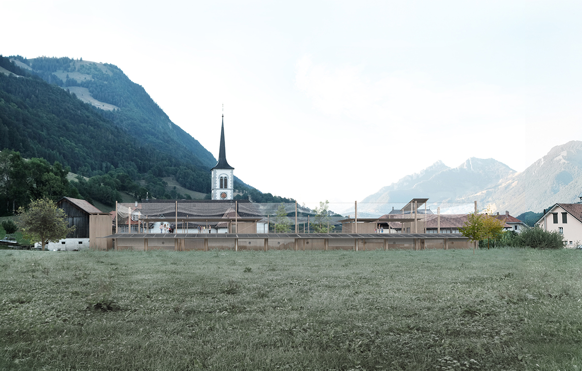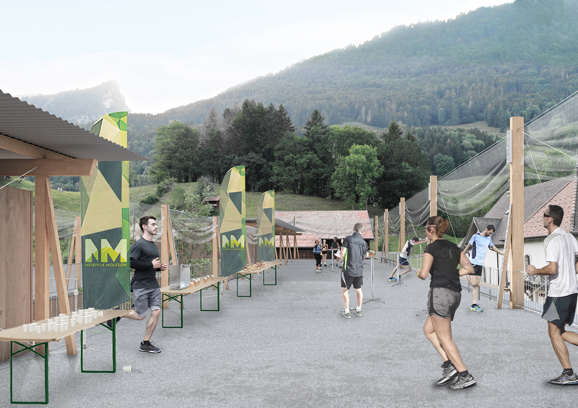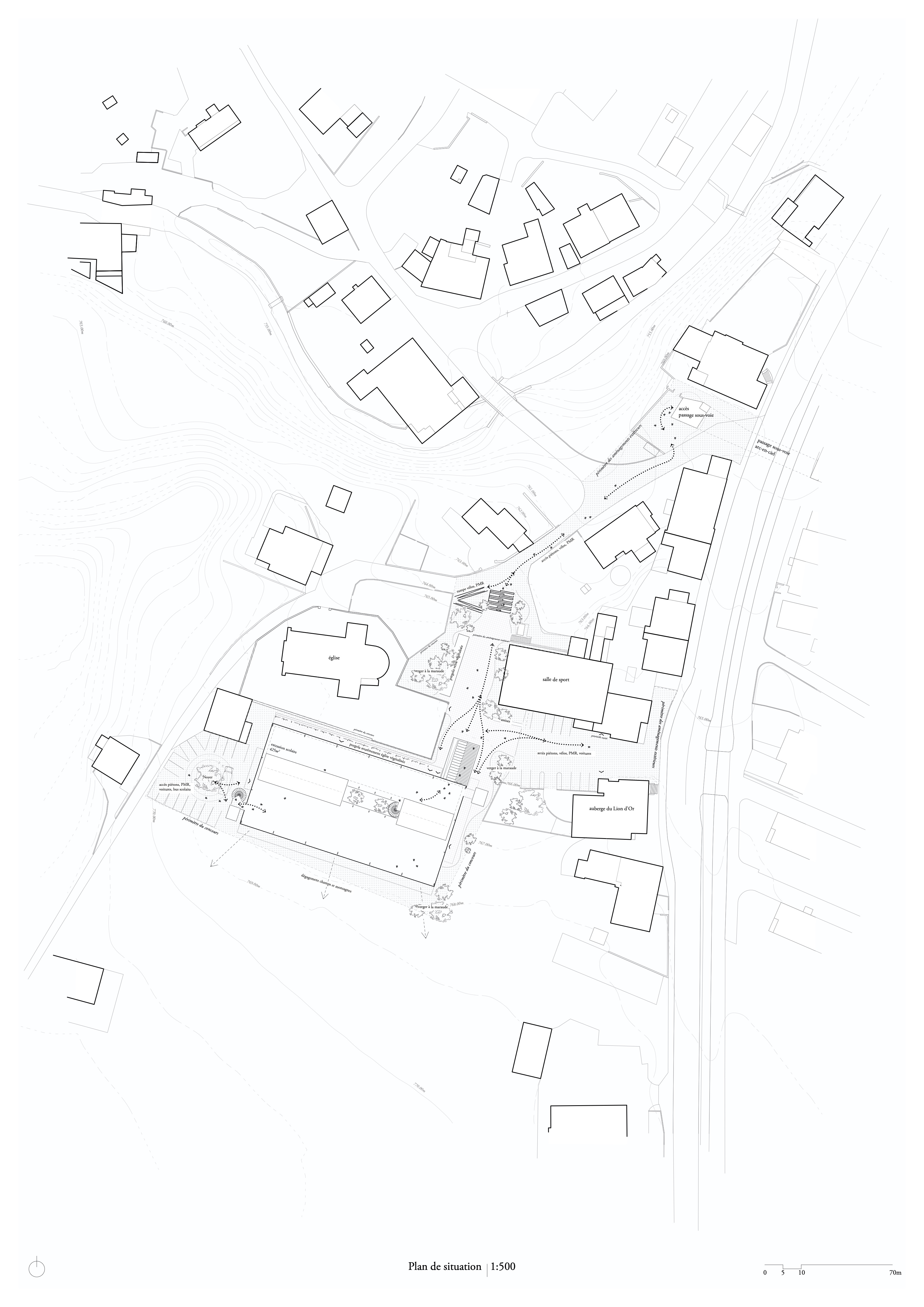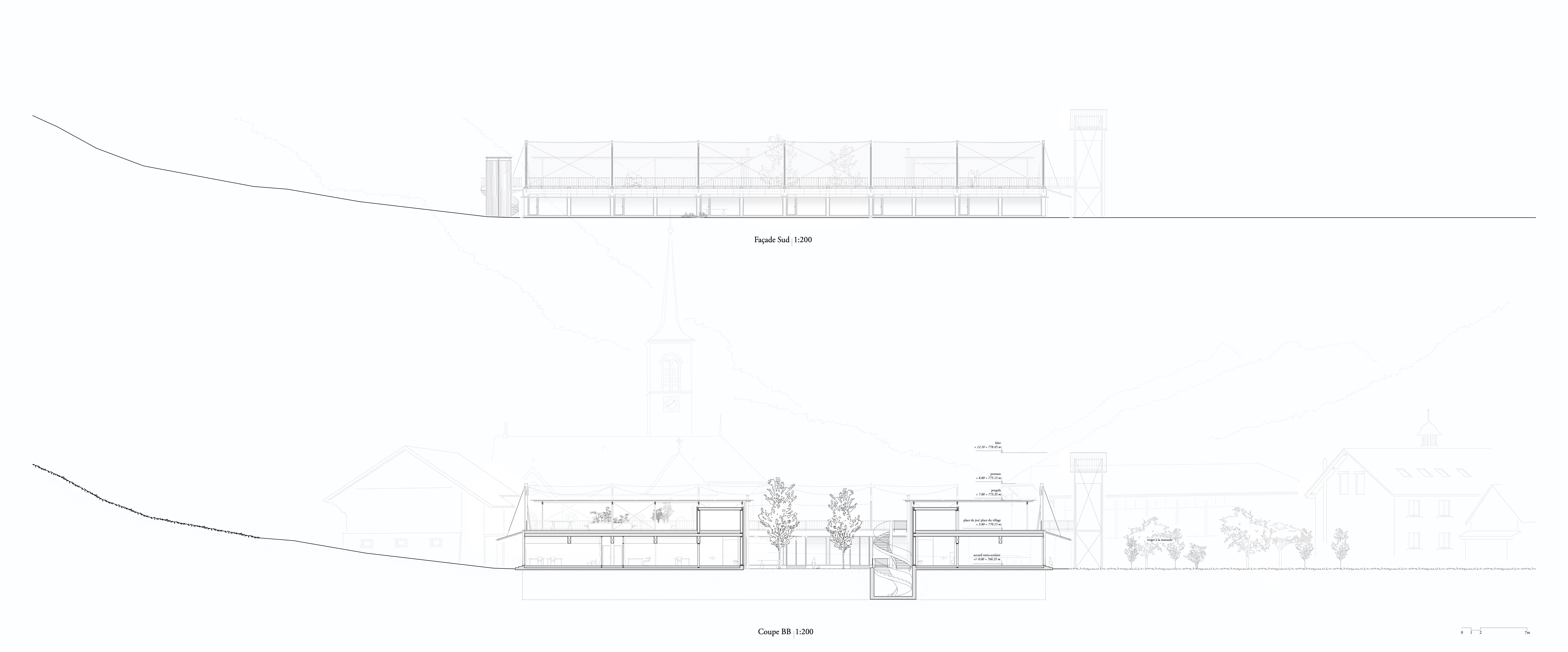 Le périmètre de concours pour l’école de Neirivue se trouve en limite du village. A cet endroit, la présence de l’église est l’élément marquant et agit comme élément distinctif pour tout le village. La salle de gymnastique et le restaurant du Lion d’Or complètent cet ensemble de bâtiments publics et constituent le décor idéal d’une vie publique villageoise active. Les vues privilégiées sur l’église imprègnent les lieux, mais c’est inévitablement les panoramas de tous côtés sur les montagnes et la verte Gruyère qui en font la principale richesse. Symboliquement la future école se doit de se servir de ces qualités contextuelles. Le parti a donc été pris de projeter toute l’école sur un seul étage, minimisant l’impact visuel du bâtiment vis-à-vis de son contexte. Plutôt que de boucher l’espace, le nouveau bâtiment propose d’en créer en offrant sa toiture en belvédère. Cette surface, identique à la parcelle sur laquelle s’inscrit le projet, joue le double rôle de cour d’école et de place de village et de se défaire de la relative exiguïté de la parcelle. Un nouvel accès depuis le village doit être crée, permettant à tous les types de mobilité de cheminer naturellement du passage sous-voie à la nouvelle place du village. Cette transition est amenée en douceur par un escalier « paysager » ainsi qu’une rampe adaptée aux mobilités douces. Cet escalier traverse un verger de maraude où des fruitiers en moyenne-tige animent le lieu au fil des saisons. Le parc à vélos et le soutènement de l’Eglise sont tout deux végétalisés par des plantes grimpantes persistantes participant à leur intégration visuelle à proximité du verger. Cet aménagement reprend l’ambiance villageoise traditionnelle, entre pavés de pierre et verger sur prairie fleurie. L’accès routier et les places de parc sont réalisés en enrobé perméable et disposés selon le programme à l’est et l’ouest de l’école. Le parking principal de l’école et la dépose bus scolaire est lui organisés autour d’un îlot central sur lequel se dresse un arbre majeur (Noyer). Cet arbre d’un côté et la tour de bois de l’autre marquent les entrées du bâtiments.
