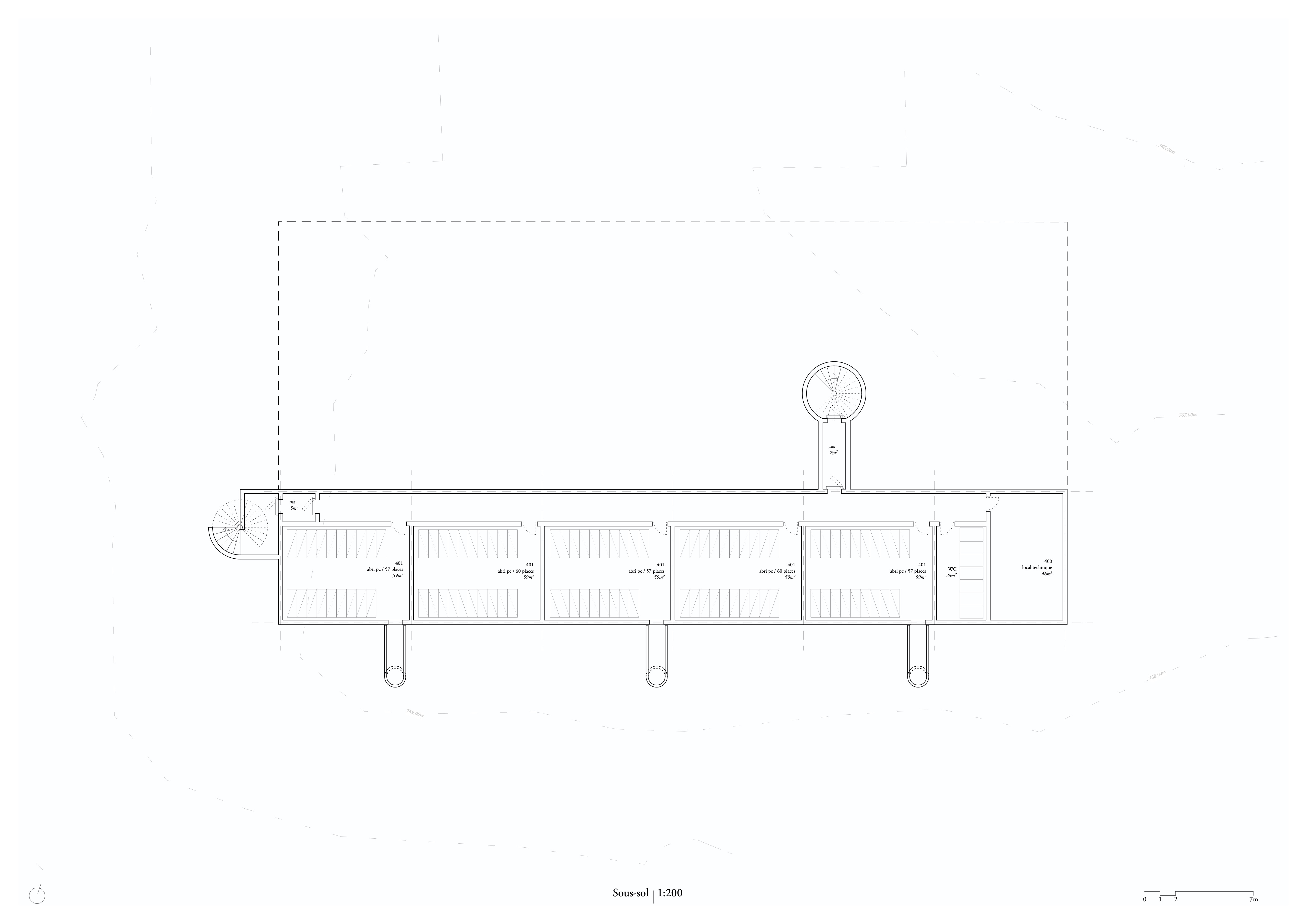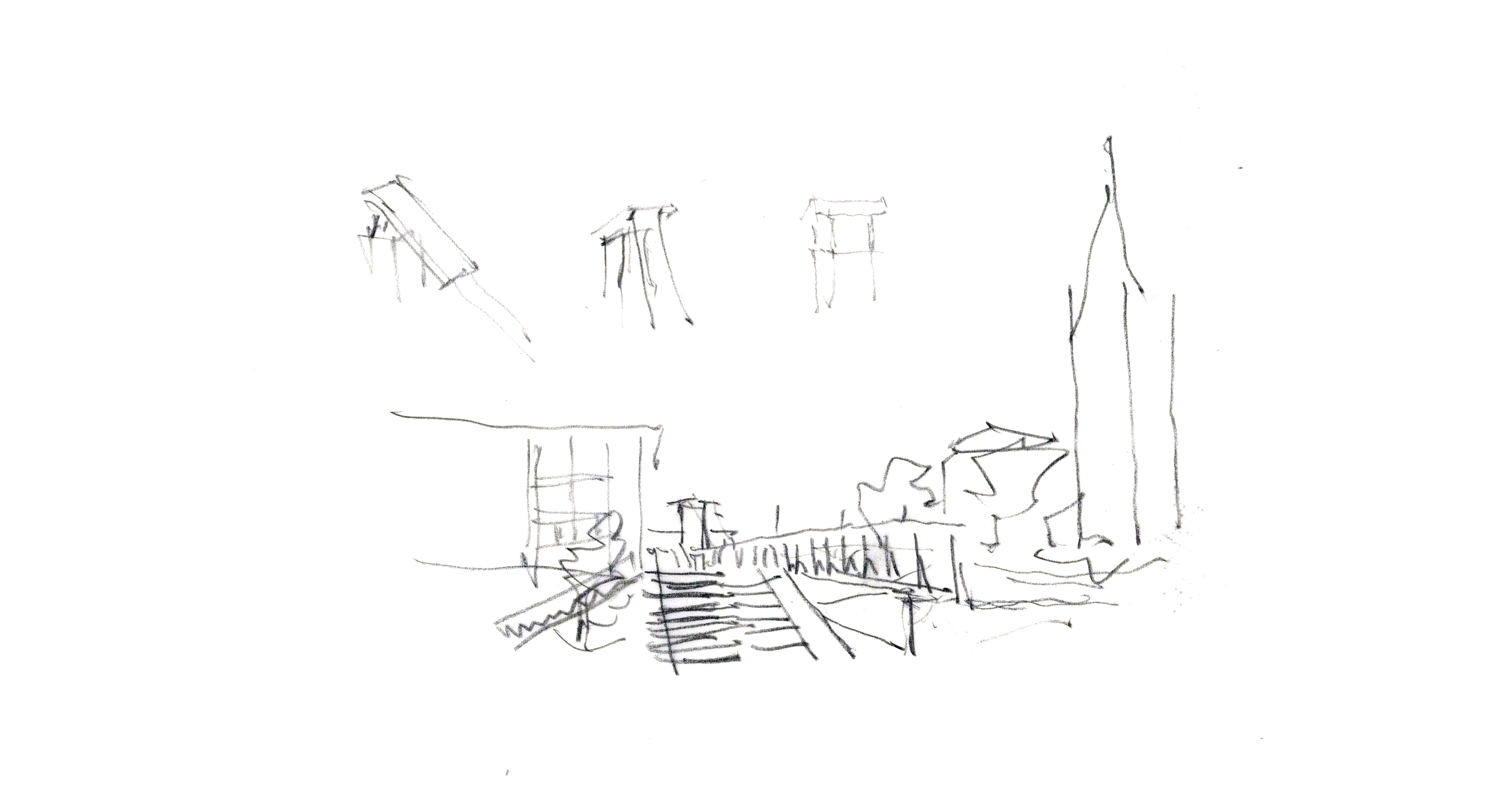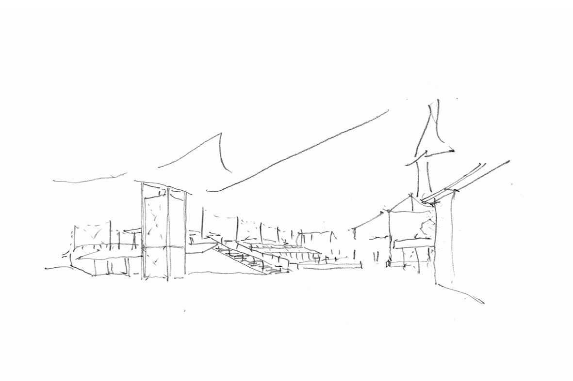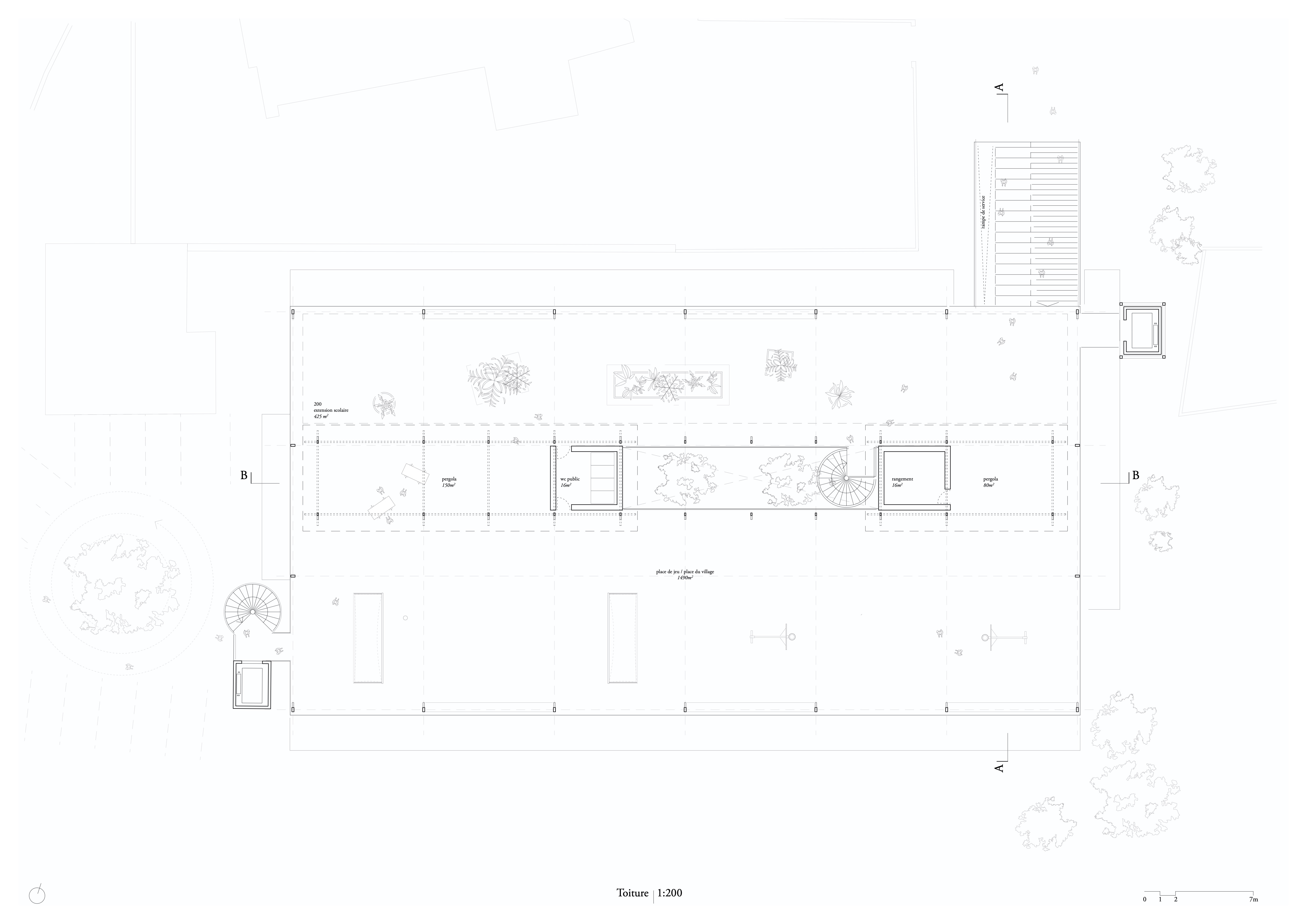 Le périmètre de concours pour l’école de Neirivue se trouve en limite du village. A cet endroit, la présence de l’église est l’élément marquant et agit comme élément distinctif pour tout le village. La salle de gymnastique et le restaurant du Lion d’Or complètent cet ensemble de bâtiments publics et constituent le décor idéal d’une vie publique villageoise active. Les vues privilégiées sur l’église imprègnent les lieux, mais c’est inévitablement les panoramas de tous côtés sur les montagnes et la verte Gruyère qui en font la principale richesse. Symboliquement la future école se doit de se servir de ces qualités contextuelles. Le parti a donc été pris de projeter toute l’école sur un seul étage, minimisant l’impact visuel du bâtiment vis-à-vis de son contexte. Plutôt que de boucher l’espace, le nouveau bâtiment propose d’en créer en offrant sa toiture en belvédère. Cette surface, identique à la parcelle sur laquelle s’inscrit le projet, joue le double rôle de cour d’école et de place de village et de se défaire de la relative exiguïté de la parcelle. Un nouvel accès depuis le village doit être crée, permettant à tous les types de mobilité de cheminer naturellement du passage sous-voie à la nouvelle place du village. Cette transition est amenée en douceur par un escalier « paysager » ainsi qu’une rampe adaptée aux mobilités douces. Cet escalier traverse un verger de maraude où des fruitiers en moyenne-tige animent le lieu au fil des saisons. Le parc à vélos et le soutènement de l’Eglise sont tout deux végétalisés par des plantes grimpantes persistantes participant à leur intégration visuelle à proximité du verger. Cet aménagement reprend l’ambiance villageoise traditionnelle, entre pavés de pierre et verger sur prairie fleurie. L’accès routier et les places de parc sont réalisés en enrobé perméable et disposés selon le programme à l’est et l’ouest de l’école. Le parking principal de l’école et la dépose bus scolaire est lui organisés autour d’un îlot central sur lequel se dresse un arbre majeur (Noyer). Cet arbre d’un côté et la tour de bois de l’autre marquent les entrées du bâtiments.