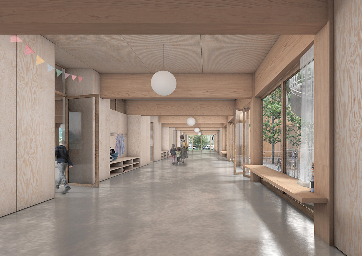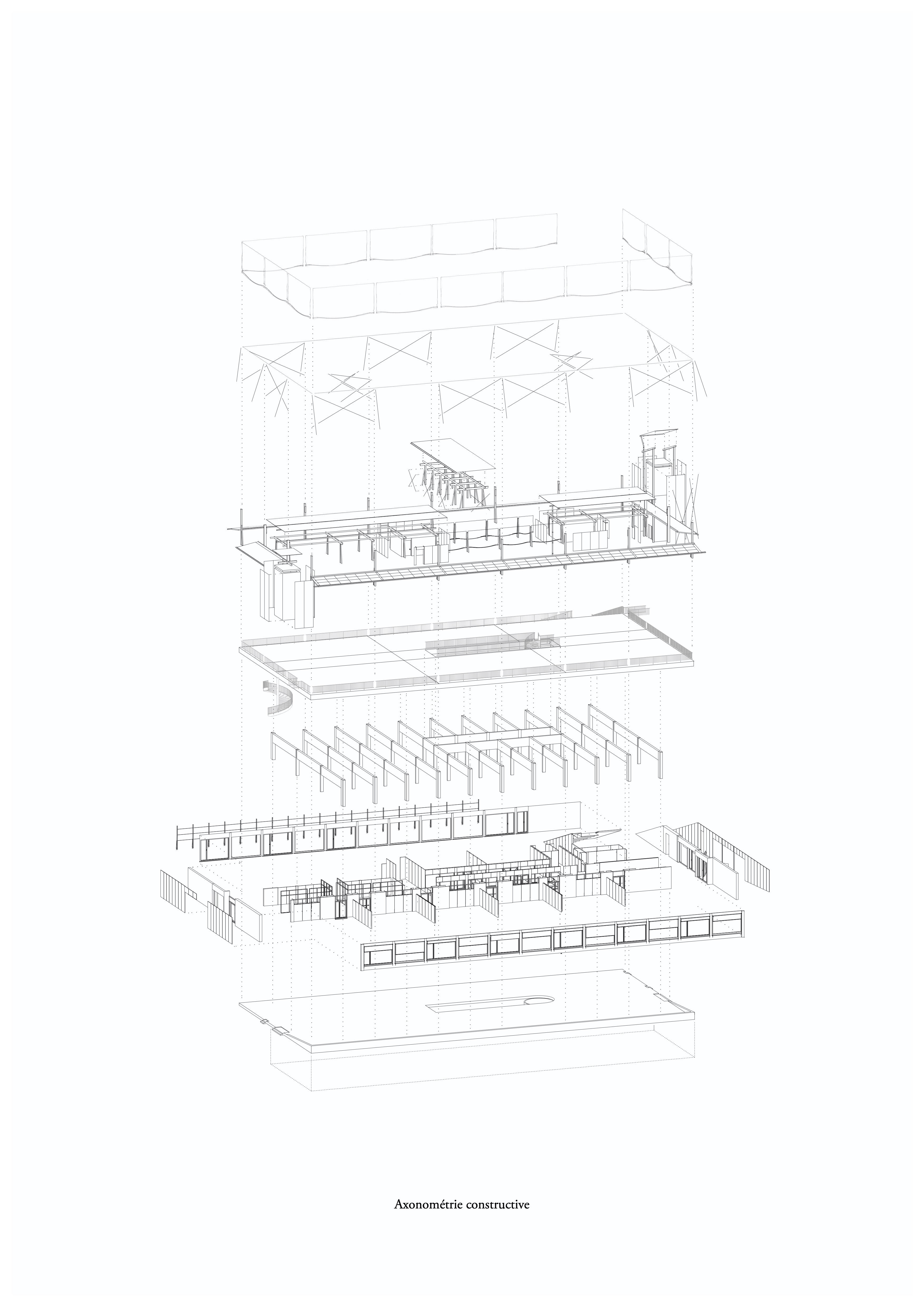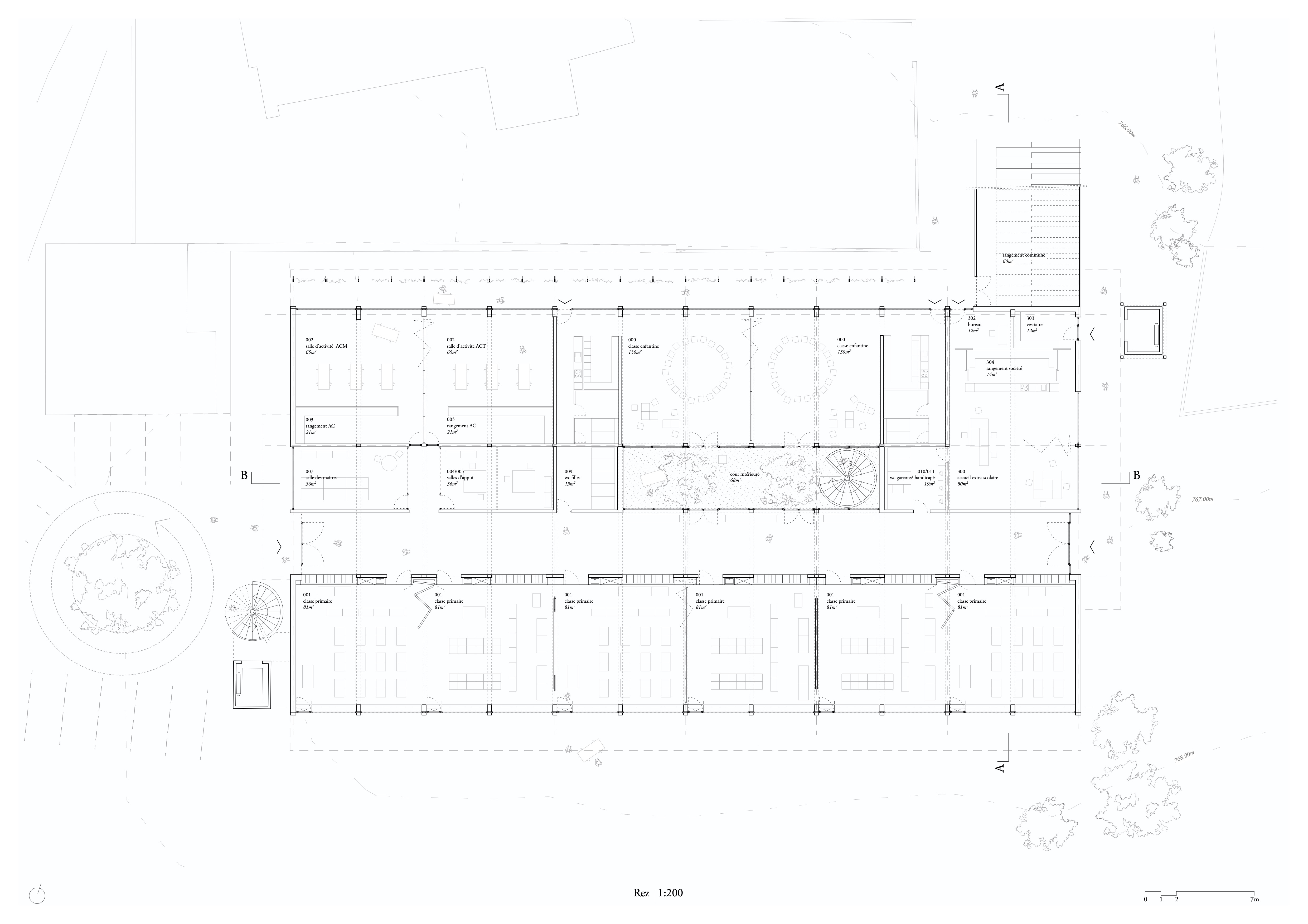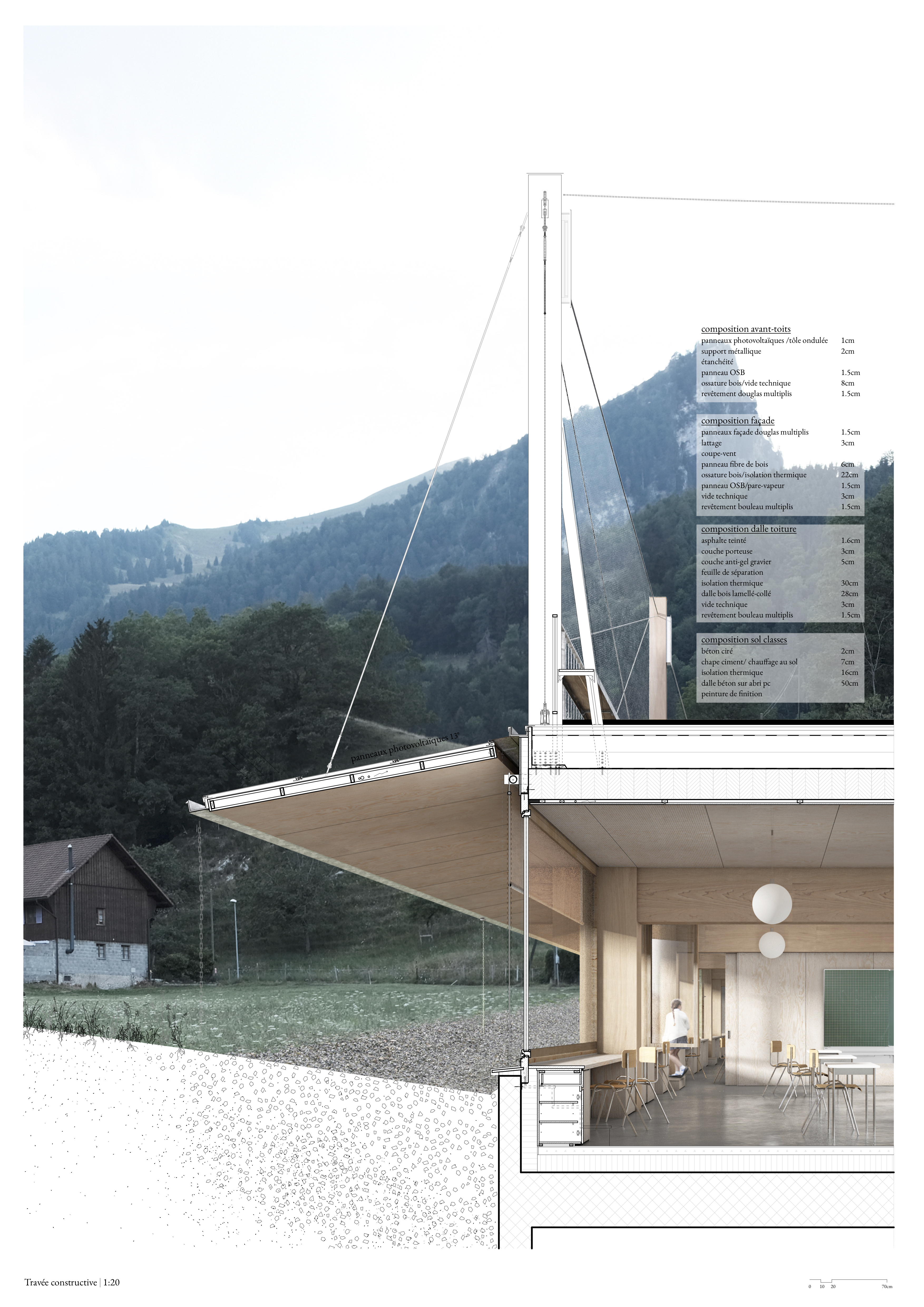 Il faut imaginer la simplicité et l’efficacité des tréteaux. Ces supports en bois entre lesquels s’installe l’élève ou le travailleur. Ces diagonales rustiques, aussi, qui animaient les façades d’une ferme d’époque, témoin sincère d’un savoir-faire ancestral qui relie le bois et l’humain. Il faut maintenant voir les tréteaux en trait d’union de ce bâtiment scolaire, à la fois lieu d’apprentissage tourné vers l’avenir et construction en bois inscrite dans un patrimoine villageois riche.