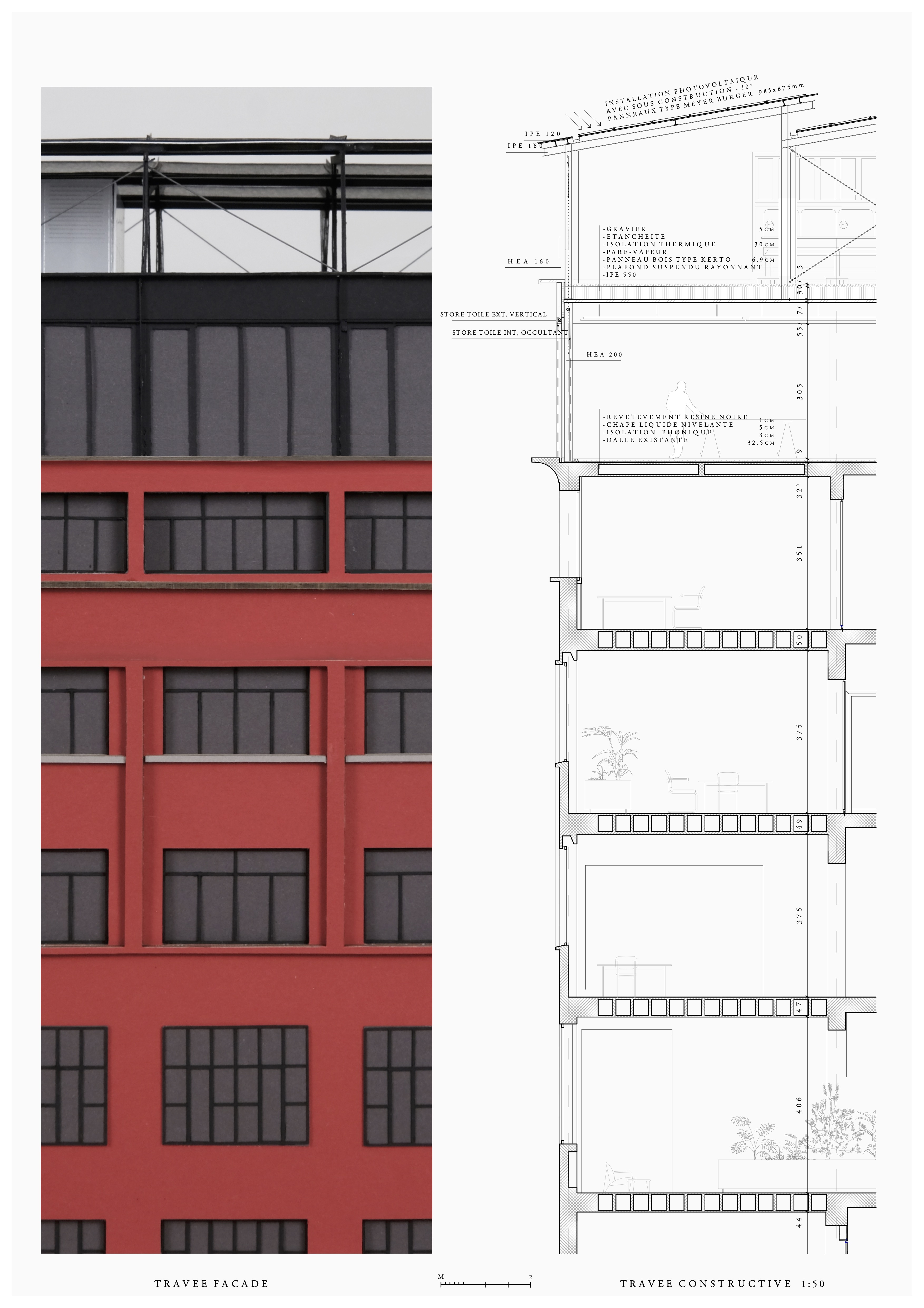 En toiture, une nouvelle lucarne redonne de la symétrie au tout et apporte la lumière naturelle nécessaire à l’appartement des combles. Intégrés avec détail à ce toit de cuivre, les panneaux photovoltaïque représentent, eux, les exigences du présent.